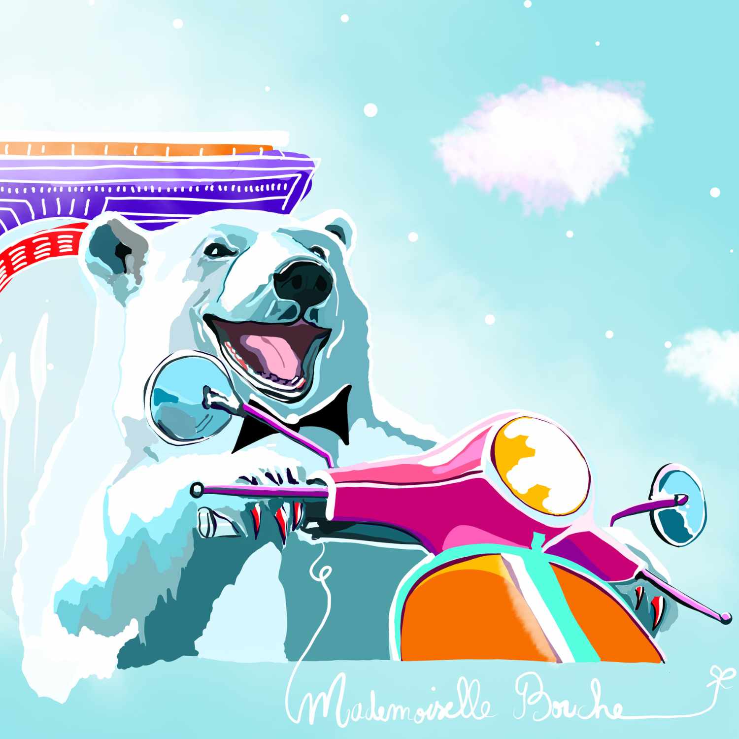 Un spationaute aux couleurs chatoyantes, un portrait avec deslignes mouvantes et dansantes, qui invite à la créativité permanente, et dont les formes et les couleurs ne se figent jamais. Elle sont en vibration permanente, comme un écho musical qui se répète avec et dans le temps, conjuguant à la fois, le passé, le présent et le futur.